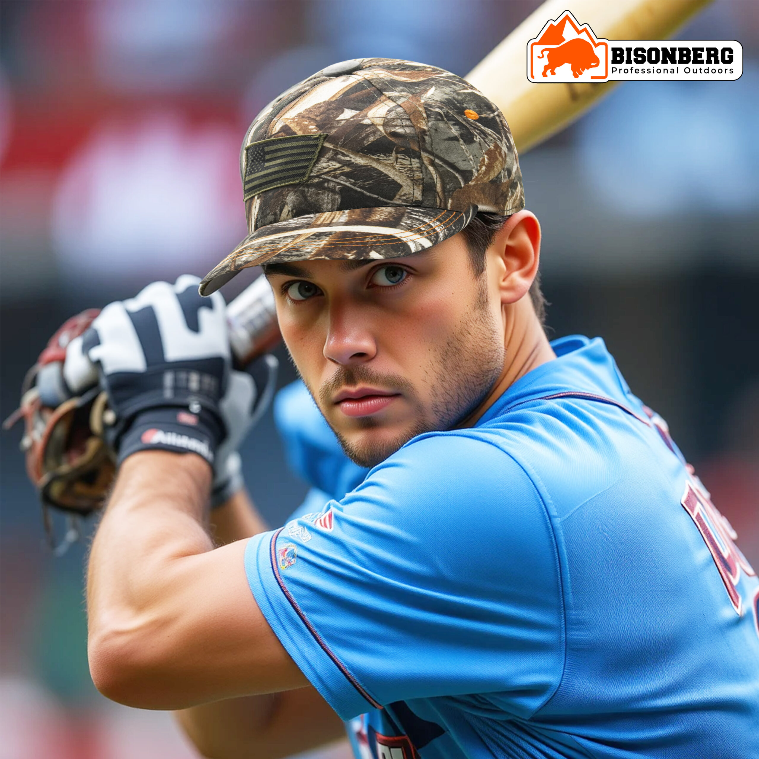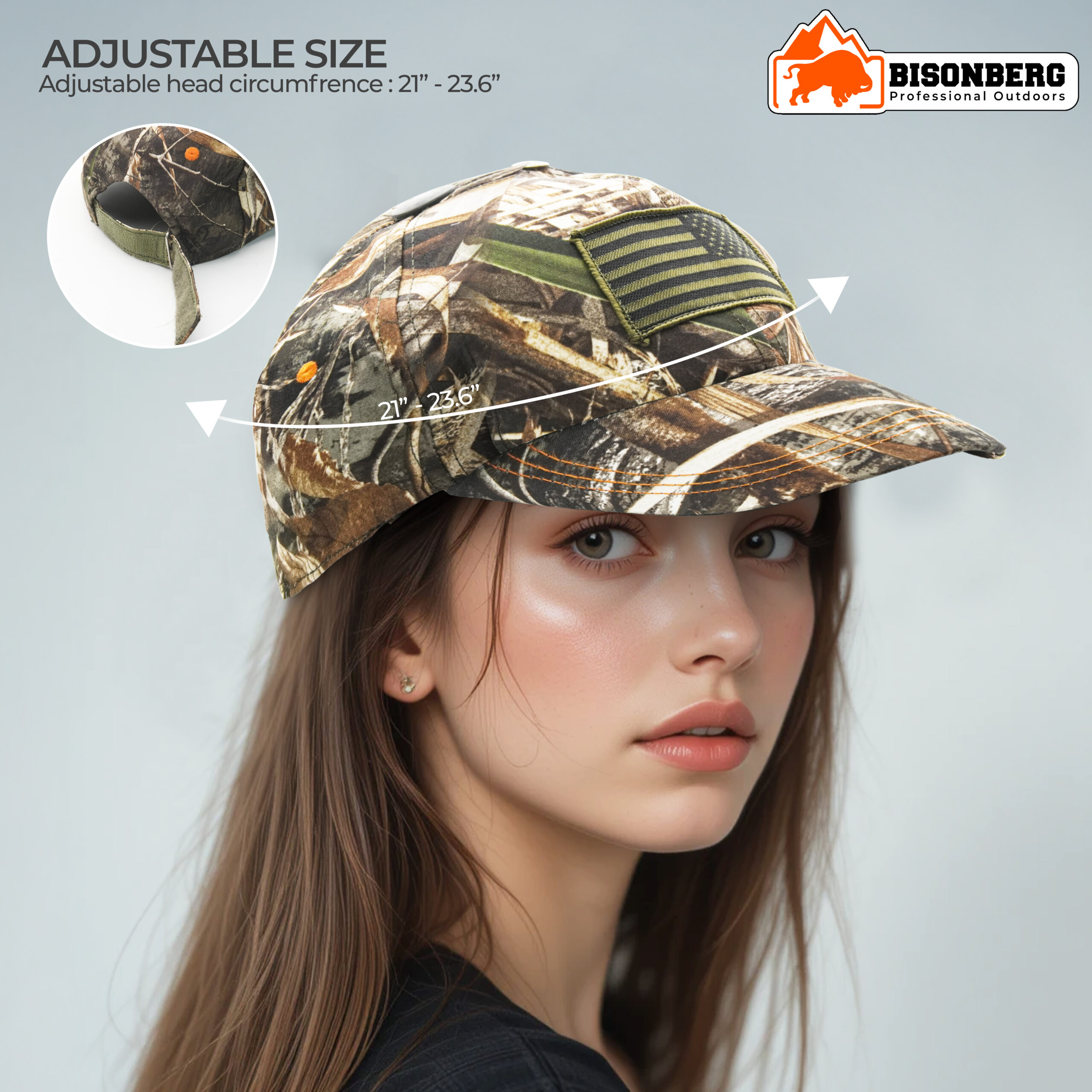 BisonBerg Camo Hunting Cap – American Flag Patch, Blaze Orange Accent, Adjustable Fit